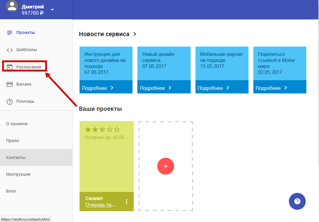 Для создания нового или редактирования уже существующего расписания необходимо перейти в список расписаний. Для этого необходимо зайти в любой проект и в верхней плашке выбрать пункт “Расписания”