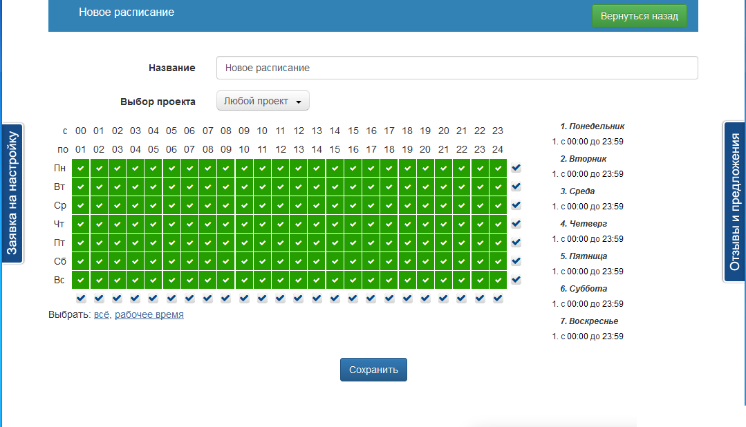 В этом режиме вы можете отредактировать интервалы работы расписания в графическом виде (слева, на узких экранах - вверху) или в текстовом виде (справа, на узких экранах - внизу), а также указать название расписания и привязку к конкретному проекту (но мы рекомендуем указывать “Любой” - обычно привязка к конкретному проекту не нужна).