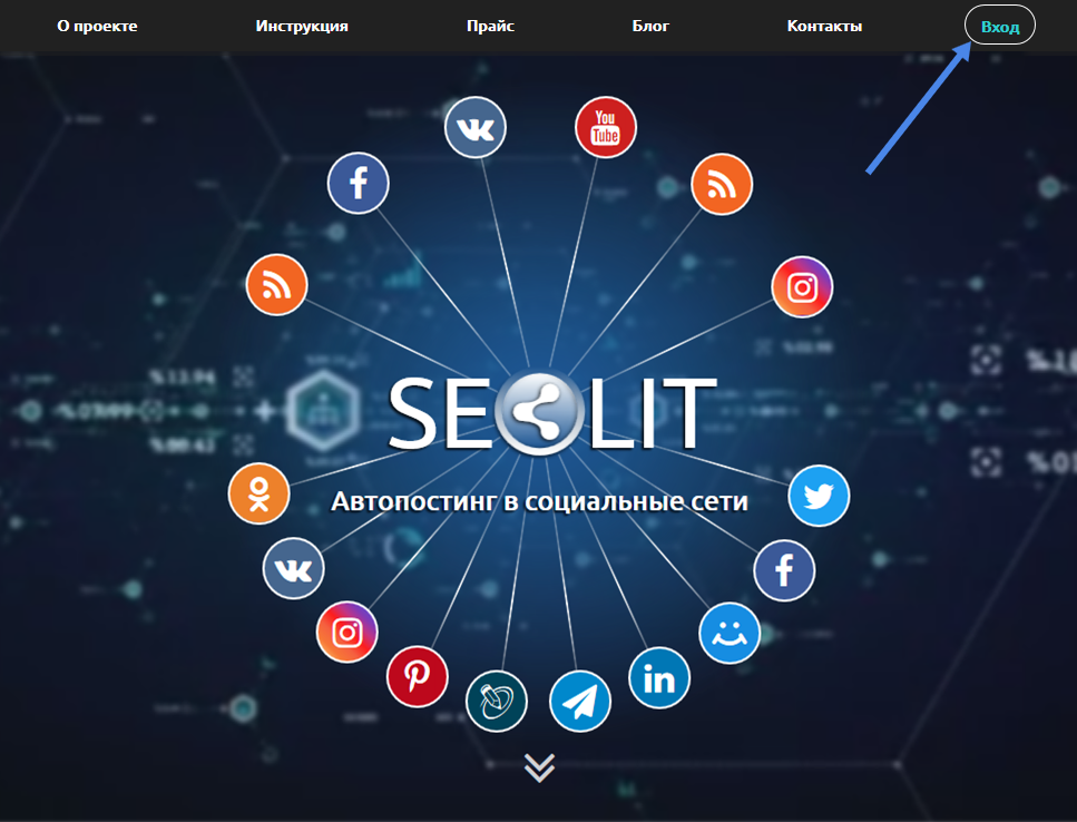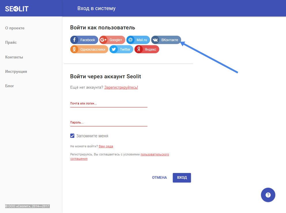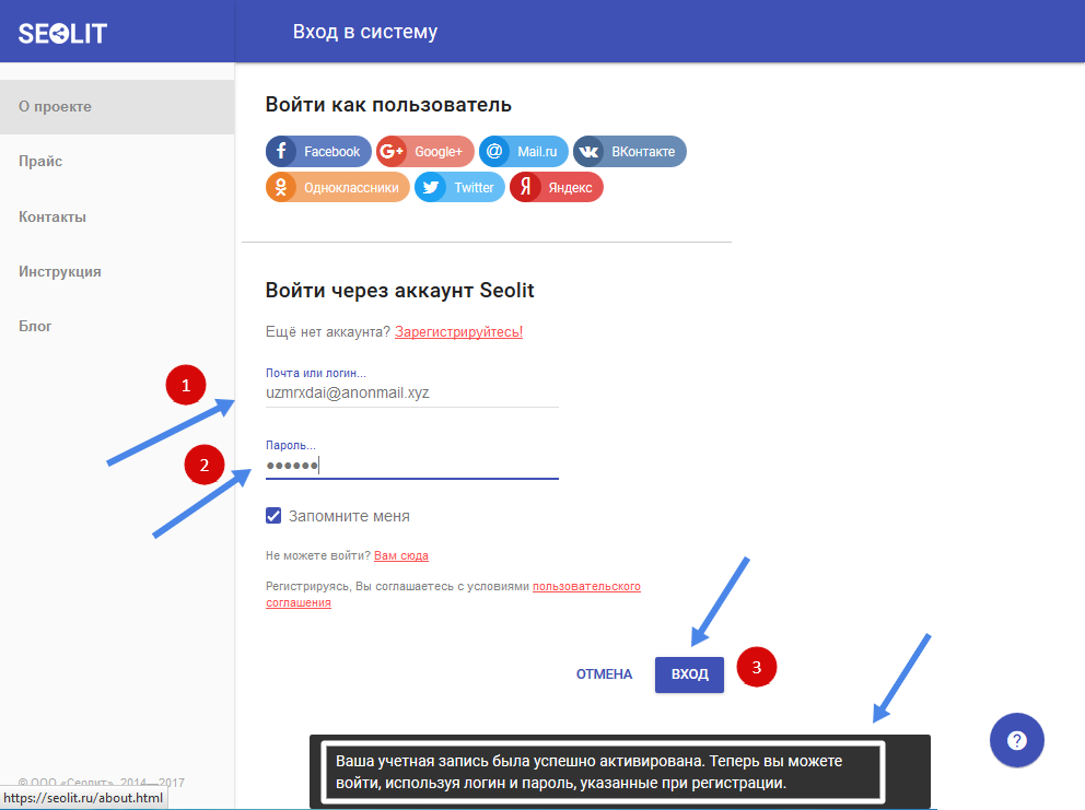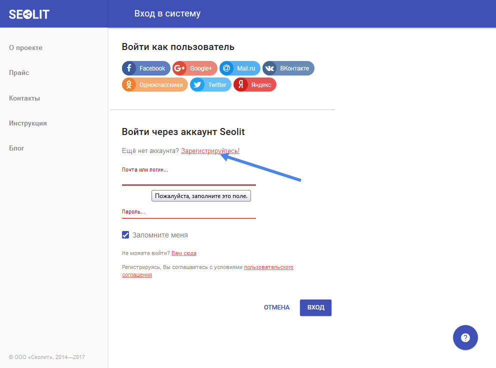 6. Вы окажетесь на странице входа в аккаунт "SEOlit". Необходимо заполнить форму для входа. Нажать кнопку "ВХОД" в форме.