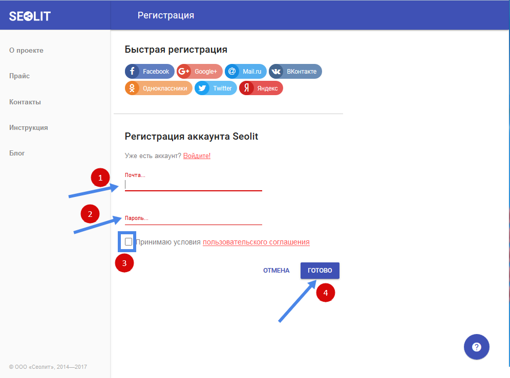 Первый вариант – создание аккаунта на сайте SEOlit. Чтобы сделать это, нажмите в форме "Зарегистрируйтесь".