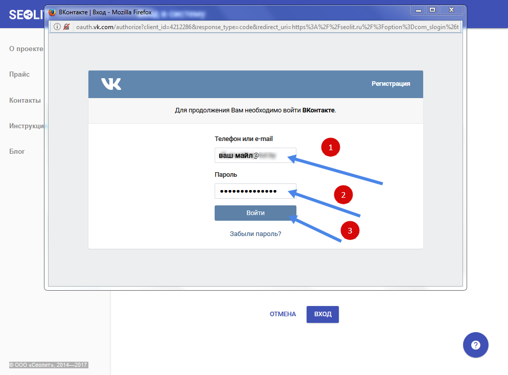 9. Введите логин и пароль Вашего аккаунта в соцсети, нажать "Войти"