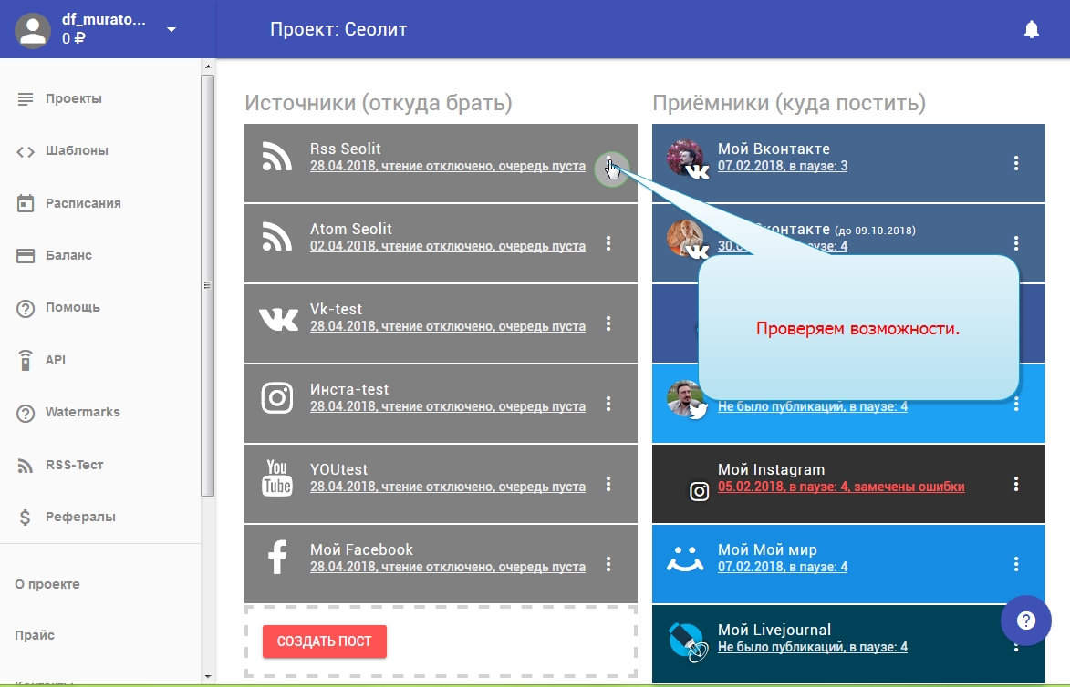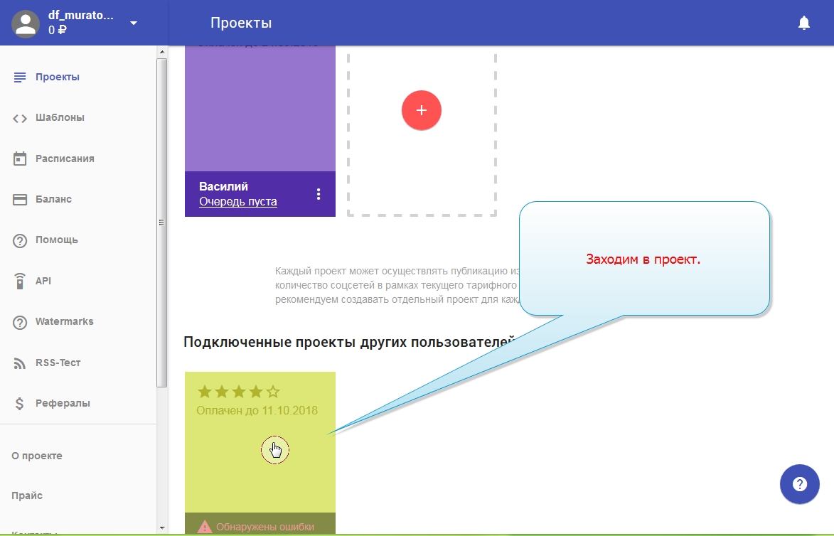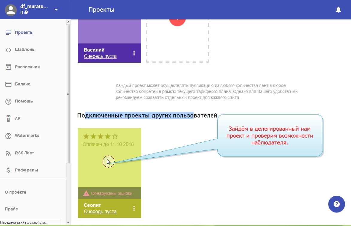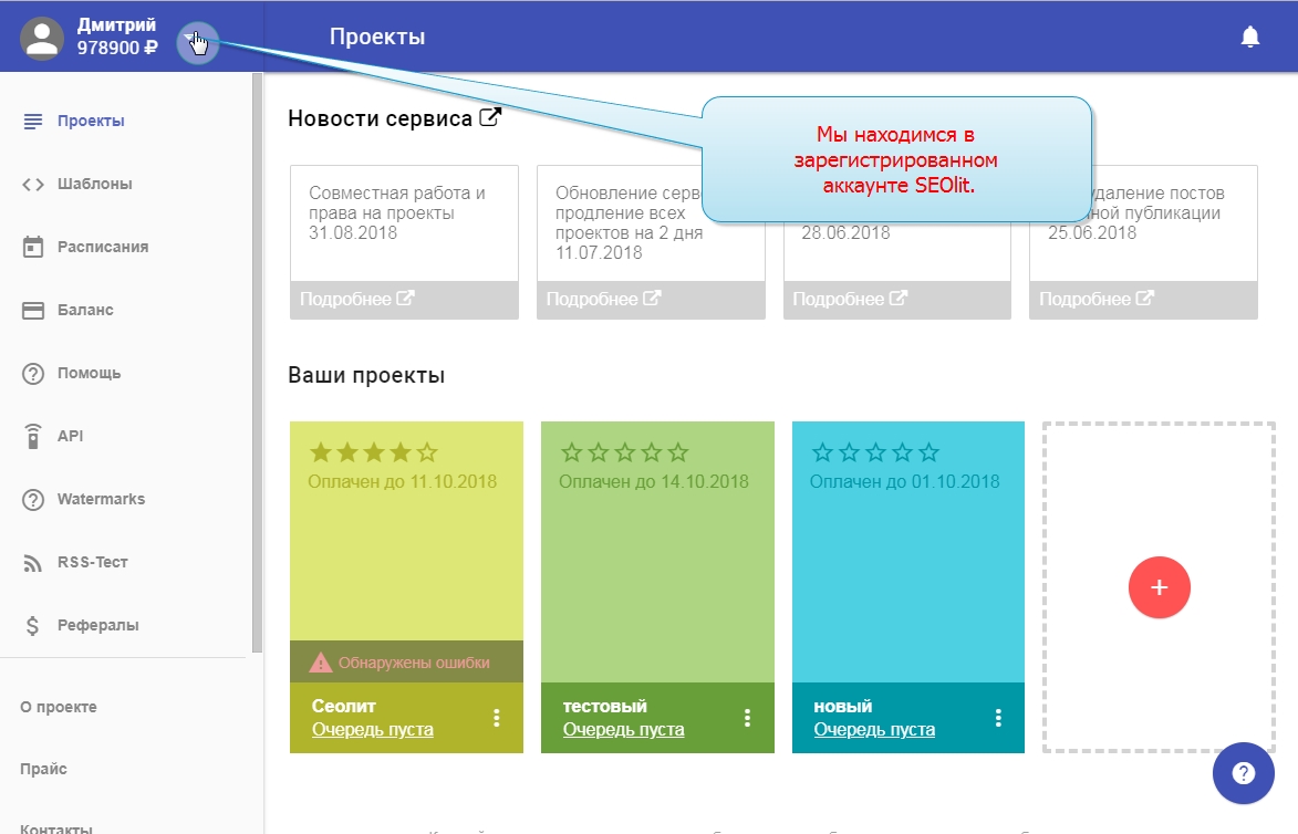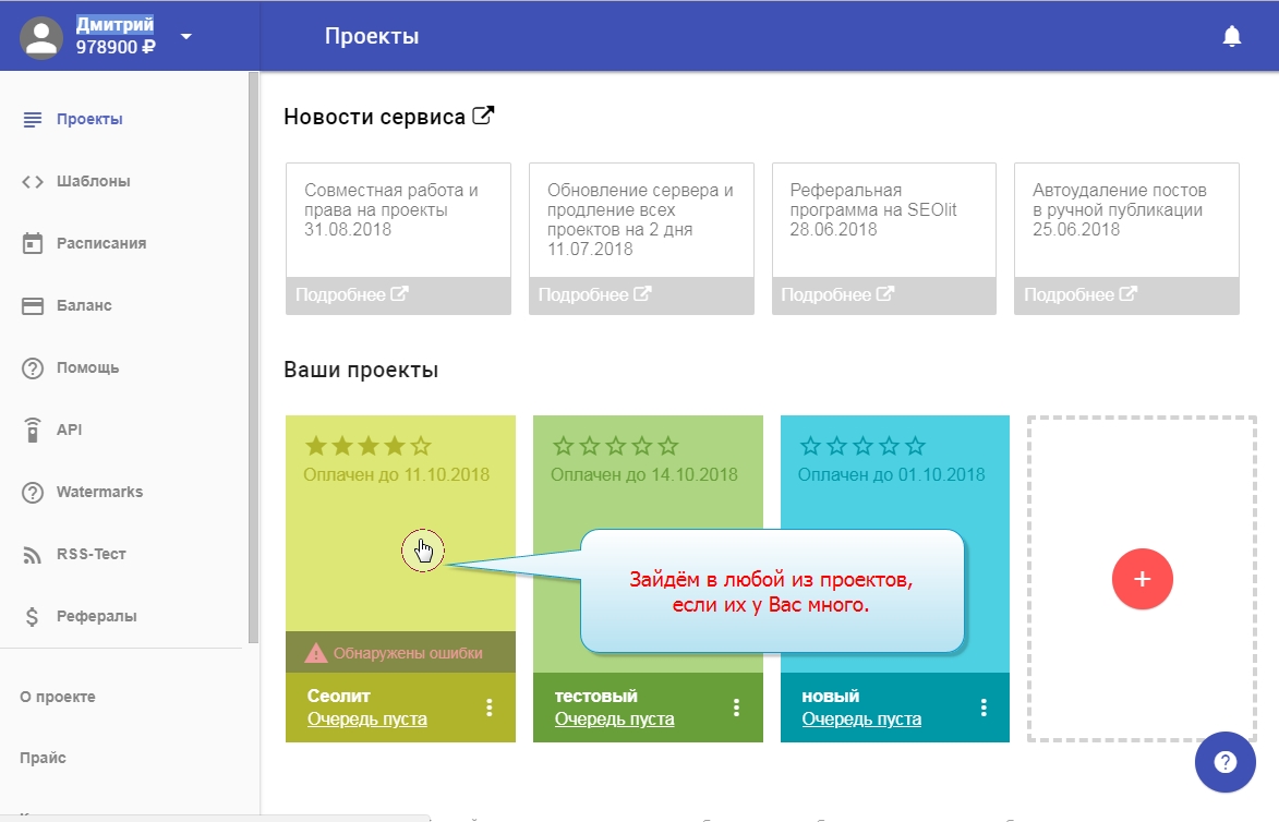 1. Вы вошли в свой профиль в Сеолите и находитесь на стадии выбора проекта.