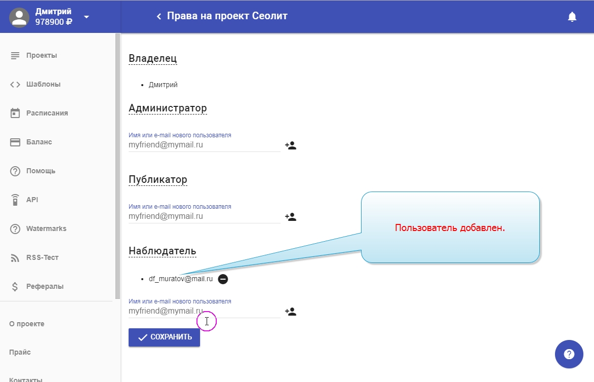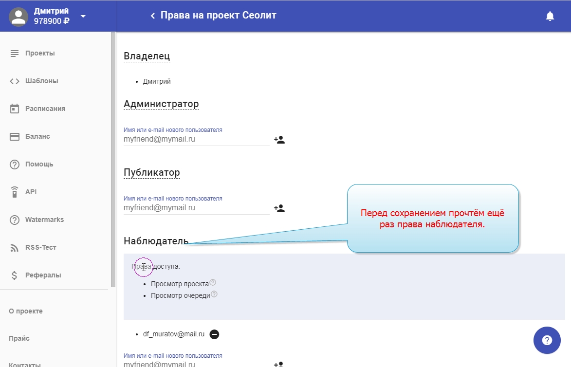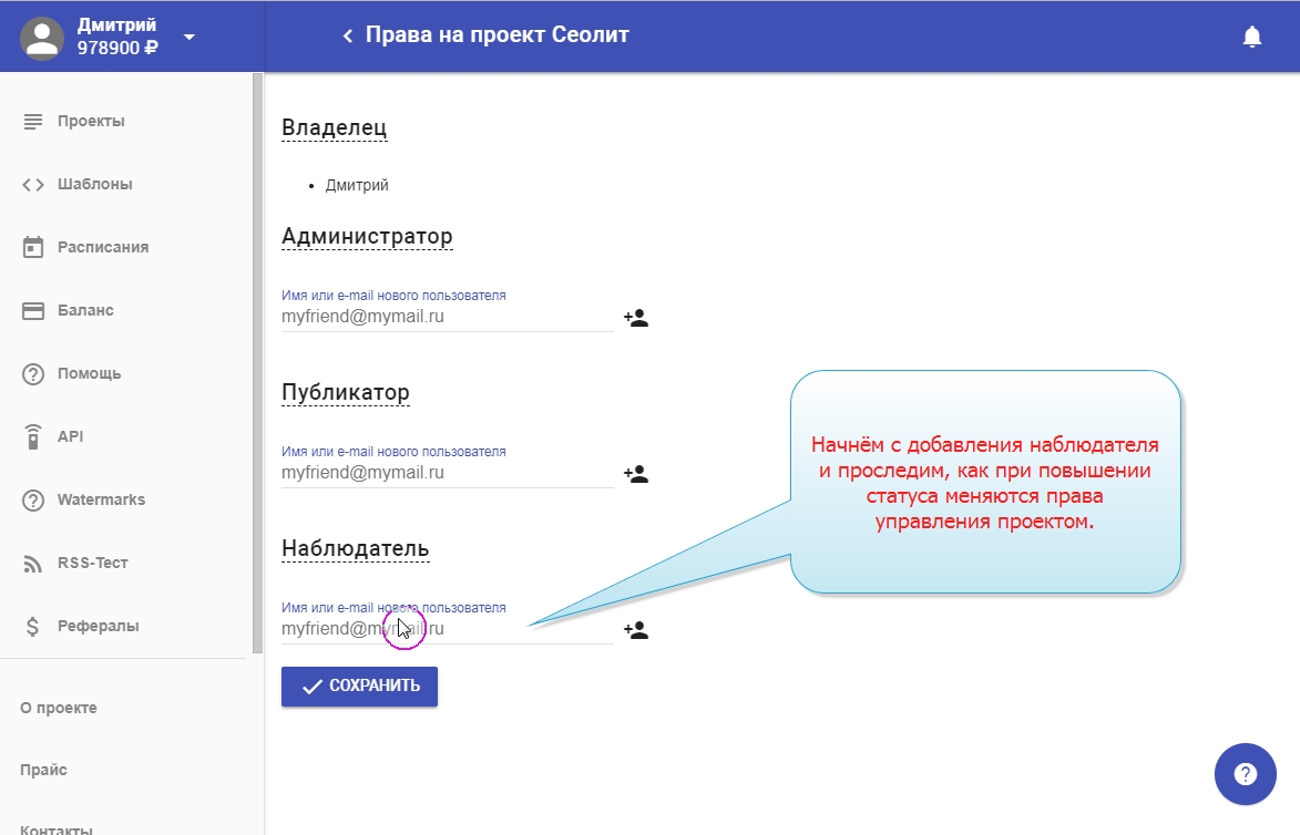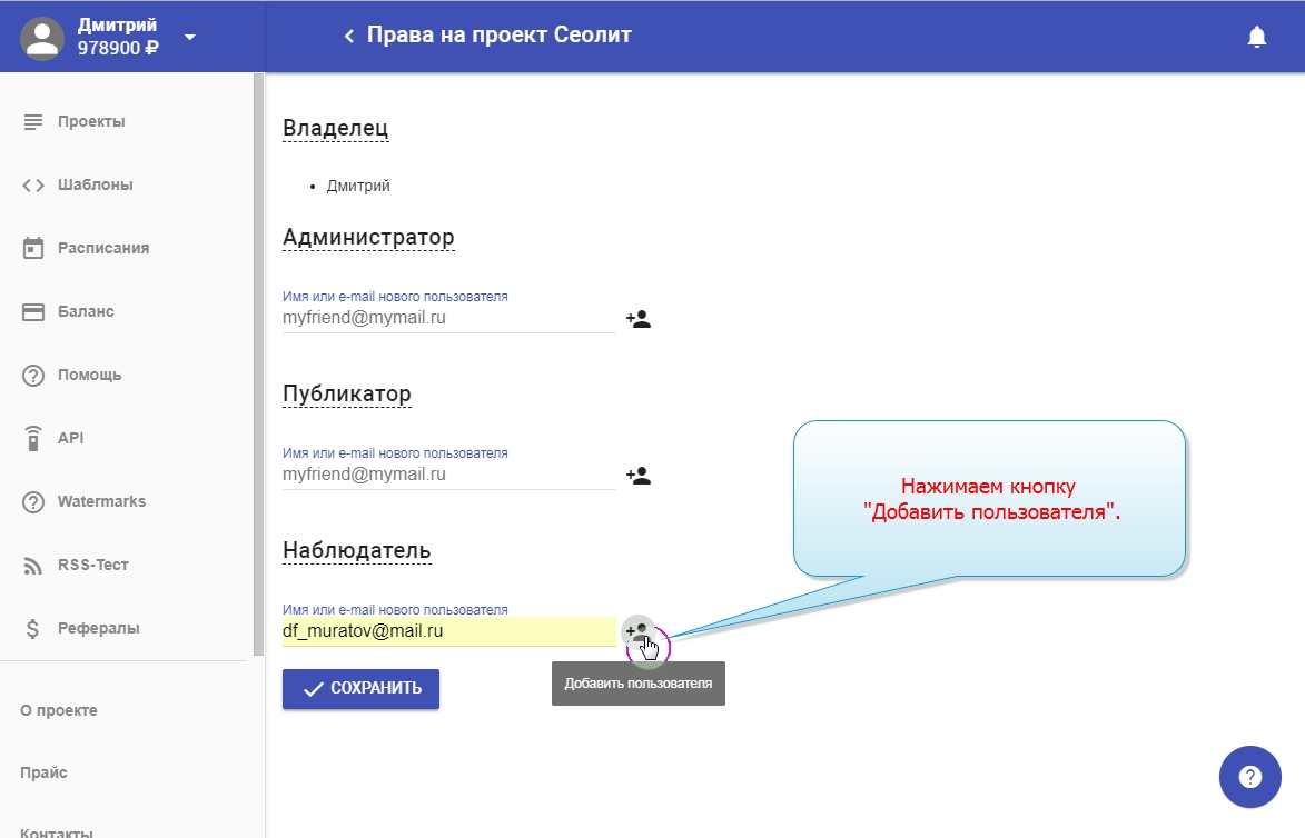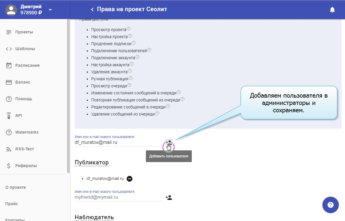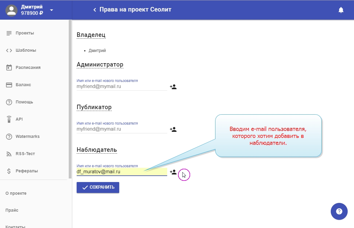 9. Вводим e-mail пользователя, которого хотим добавить в наблюдатели.