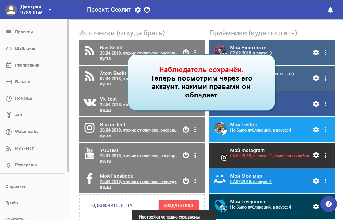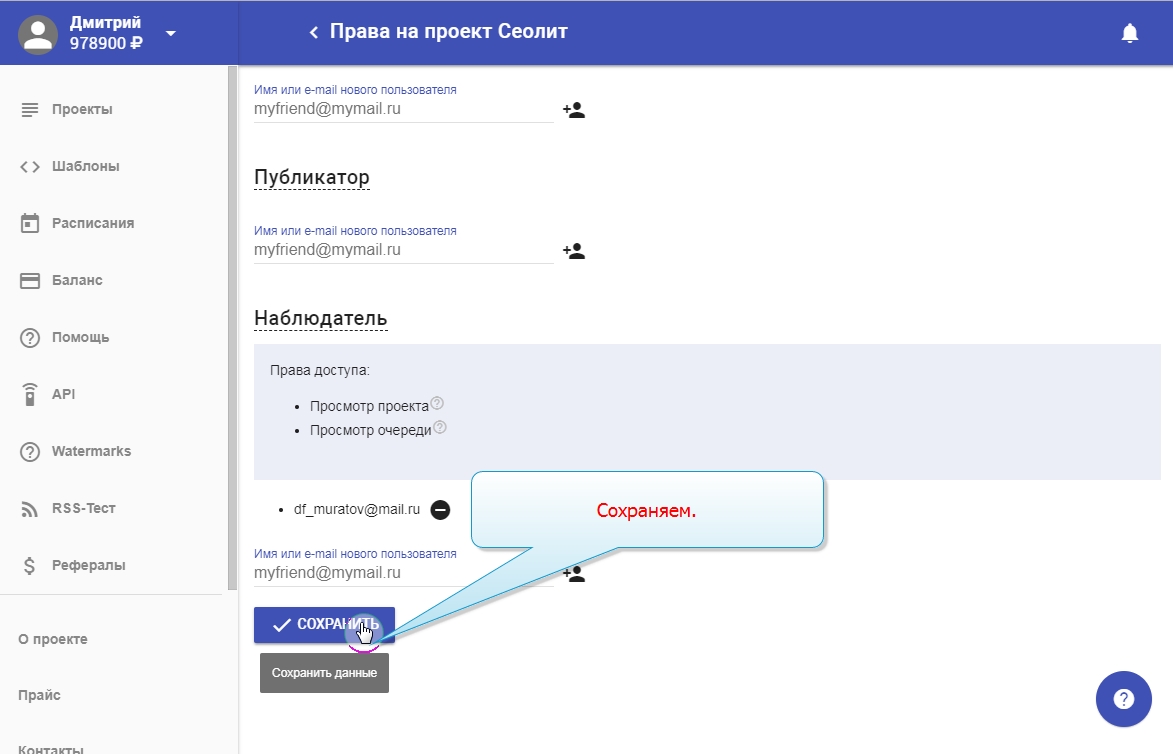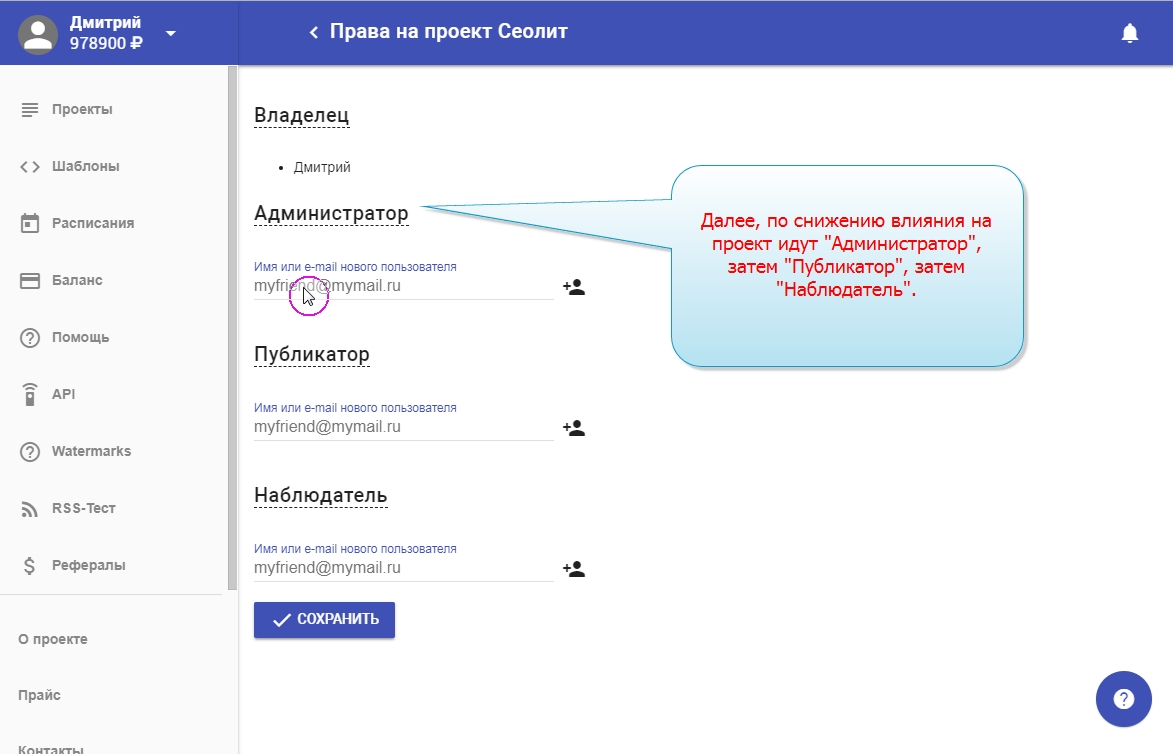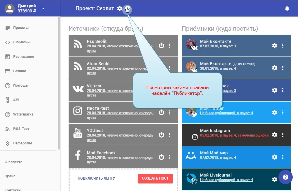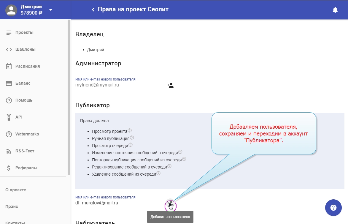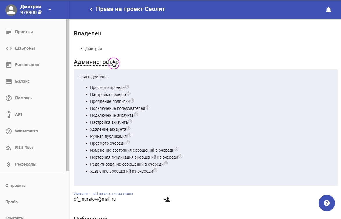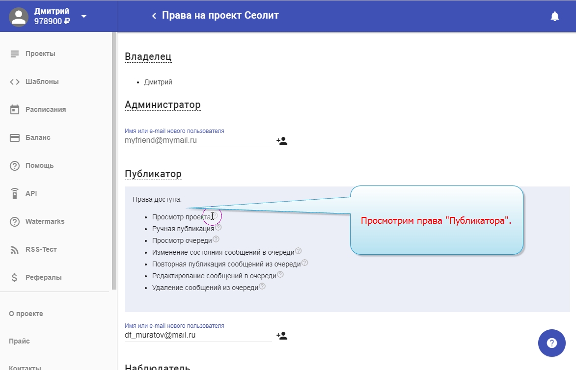 18. Перейдём в аккаунт владельца и посмотрим какими правами наделён публикатор.