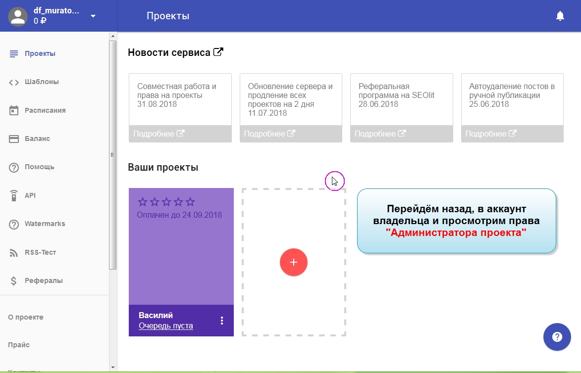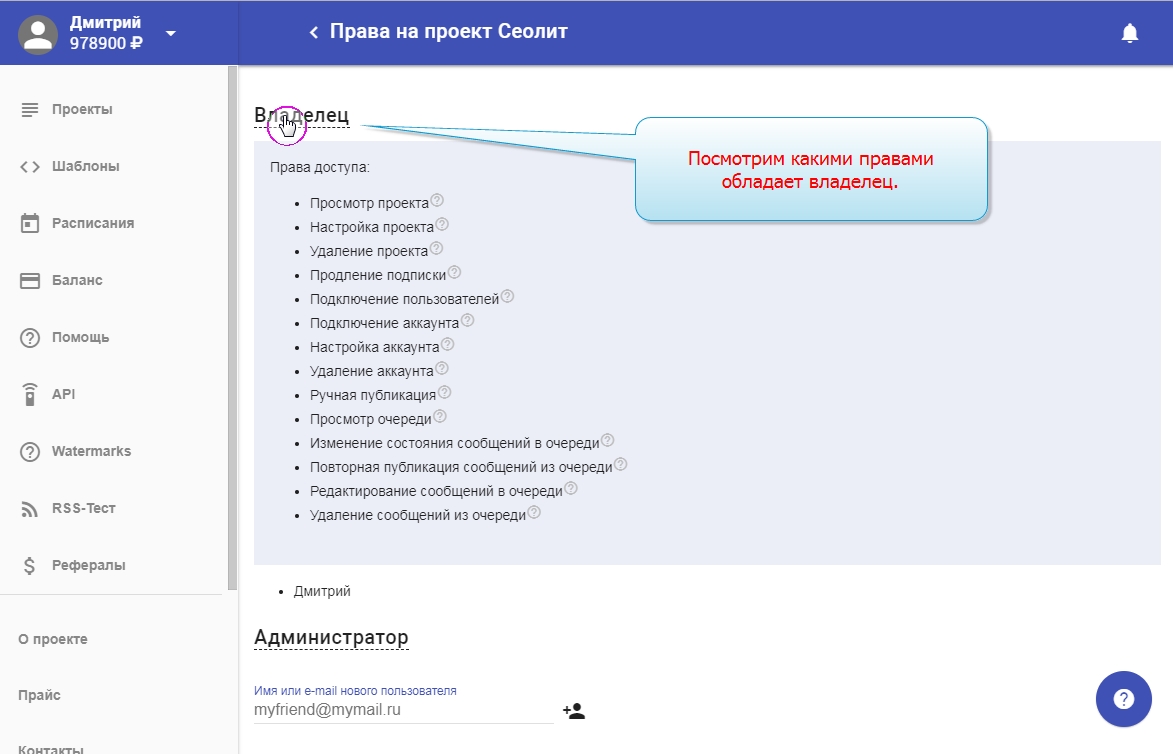 26. Перейдём назад в аккаунт владельца и посмотрим права администратора.