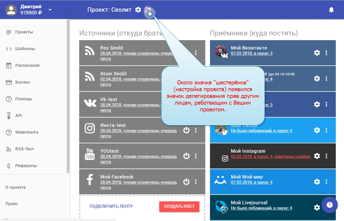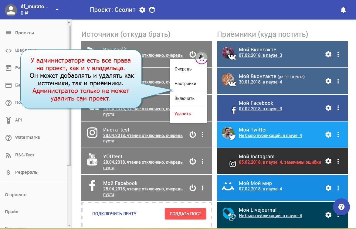 30. У администратора есть все права на проект, как и у владельца. Он может добавлять и удалять как источники, так и приёмники. Администратор только не может удалить сам проект.