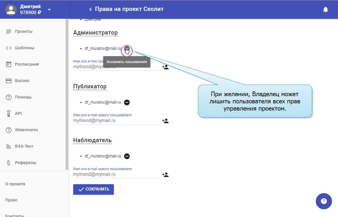 31. При желании, владелец может лишить пользователя всех прав управления проектом.