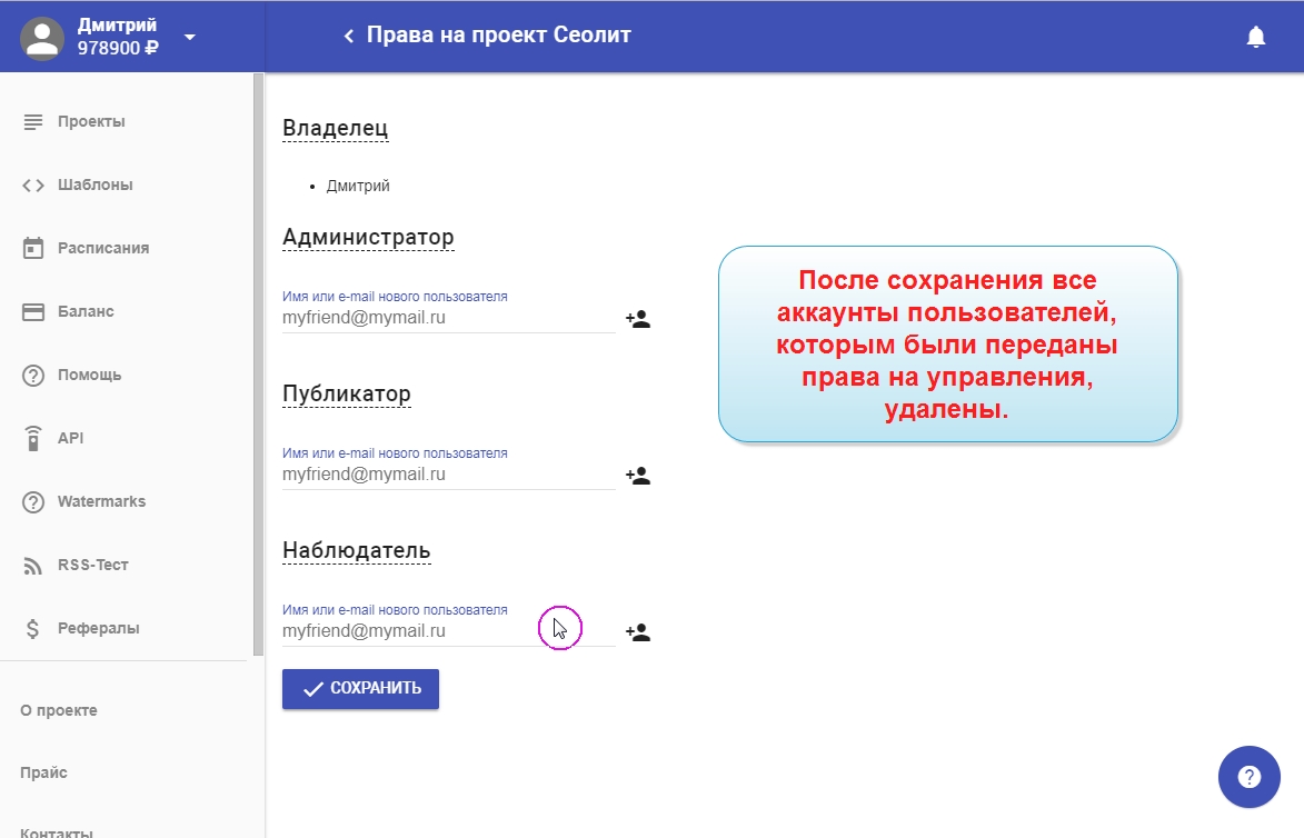 32. После сохранения все аккаунты пользователей, которым были переданы права на управления, удалены.
