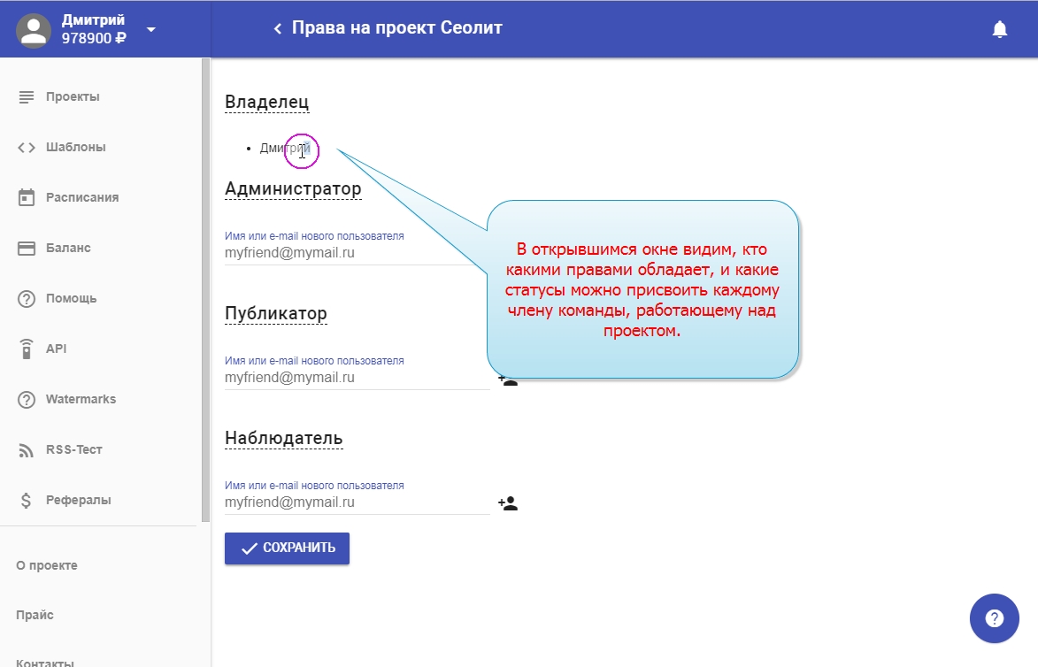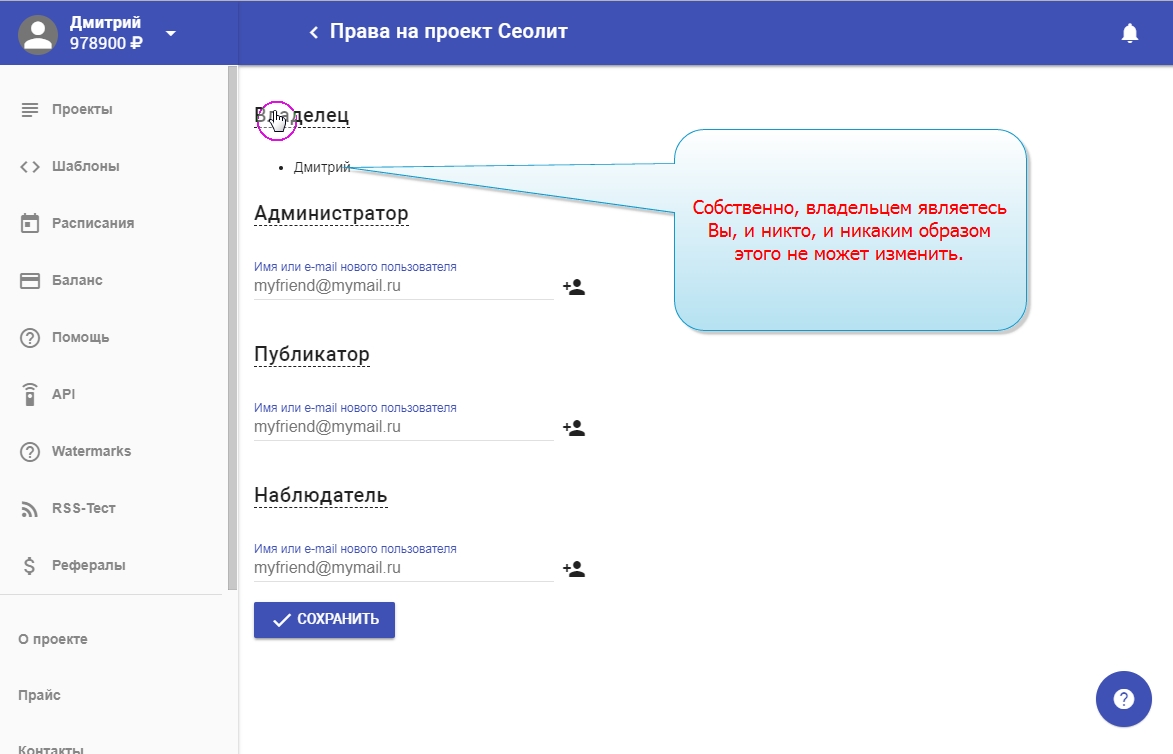 5. Чтобы посмотреть права на проект у владельца, нажимаем на заголовок "Владелец".
